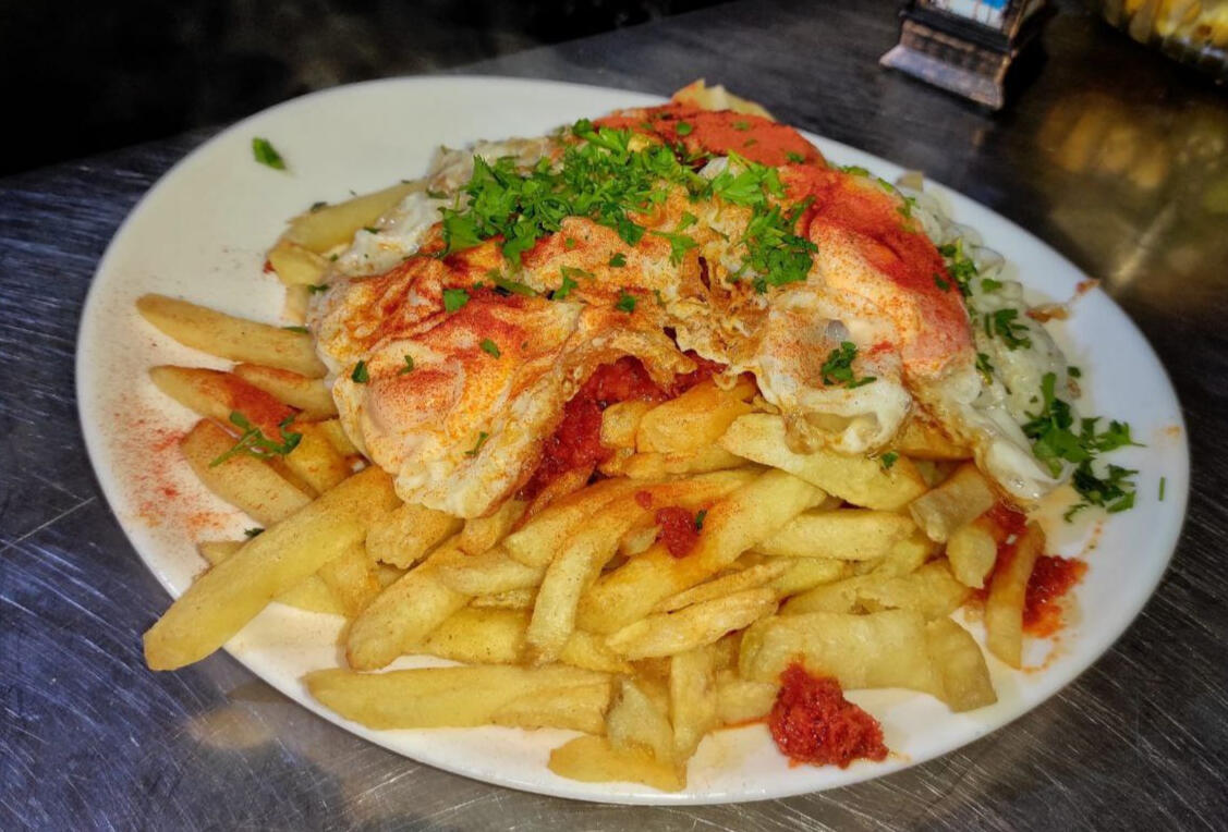 French fries dipped in chorizo with fried eggs.Churros de pescado: 5,00 / 8,50€